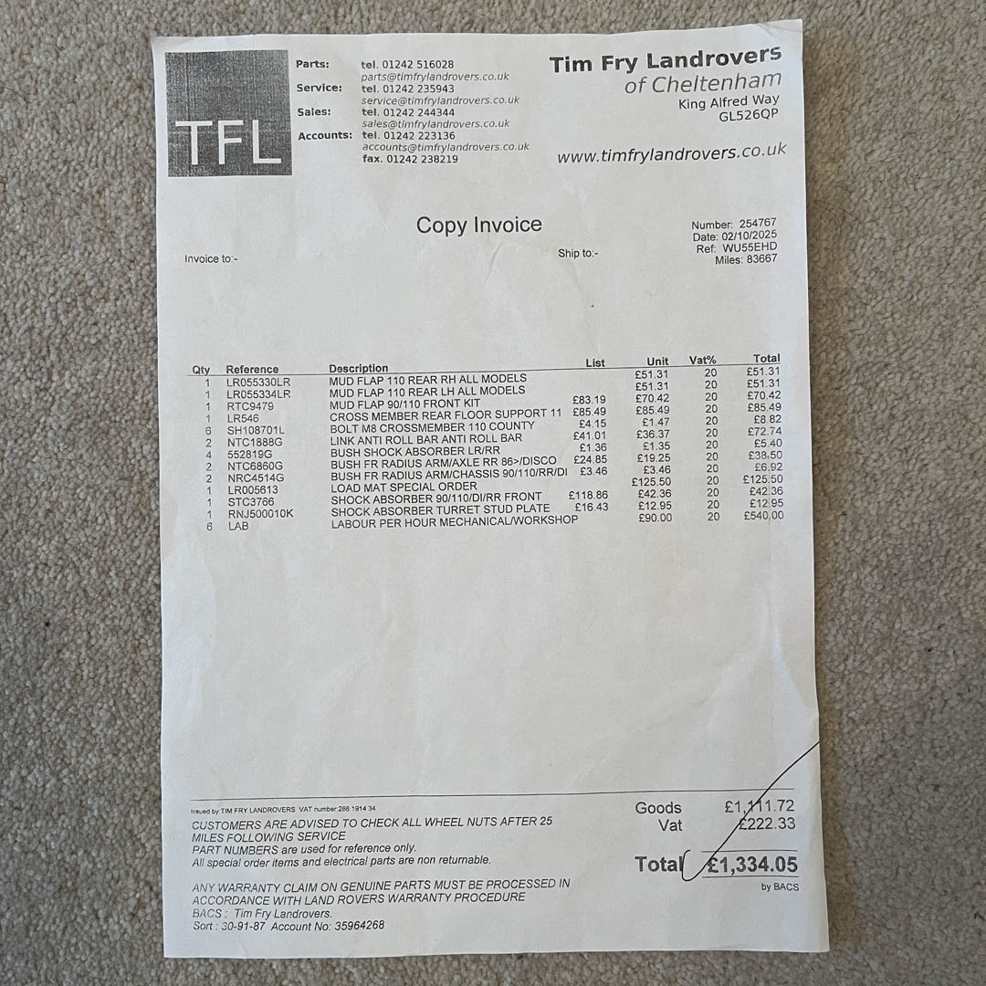 With just under 83k miles from new the engine runs beautifully, with no smoke either on start up or when running. The car has been meticulously maintained over its life. The service book records 13 service stamps from new, up to 2021, from a mixture of Land Rover dealers and specialists. Service records from 2022 to the most recent carried out in August 2025 (at 83,094 miles) are evidenced by invoices. These join a comprehensive set of service, maintenance, upgrades and parts invoices, dating back to 2008 in the car’s documentary history file.